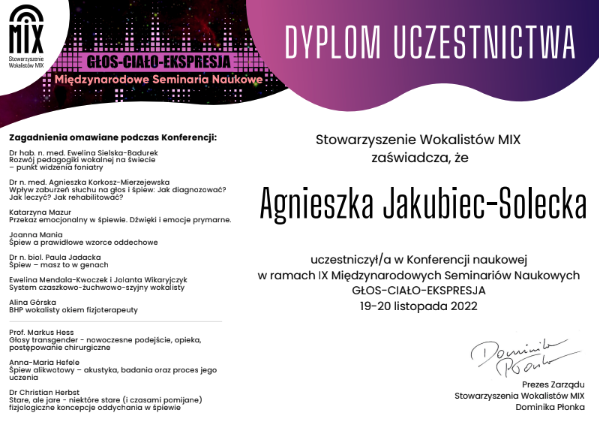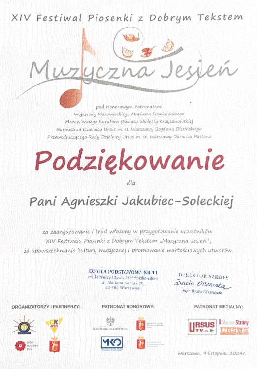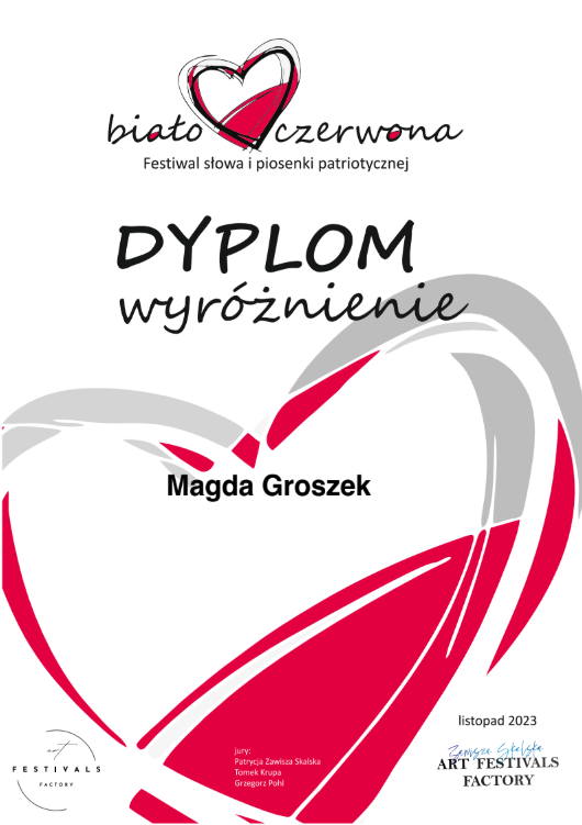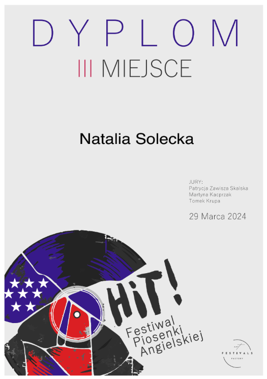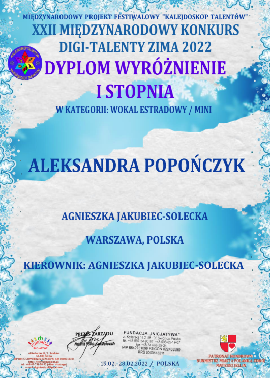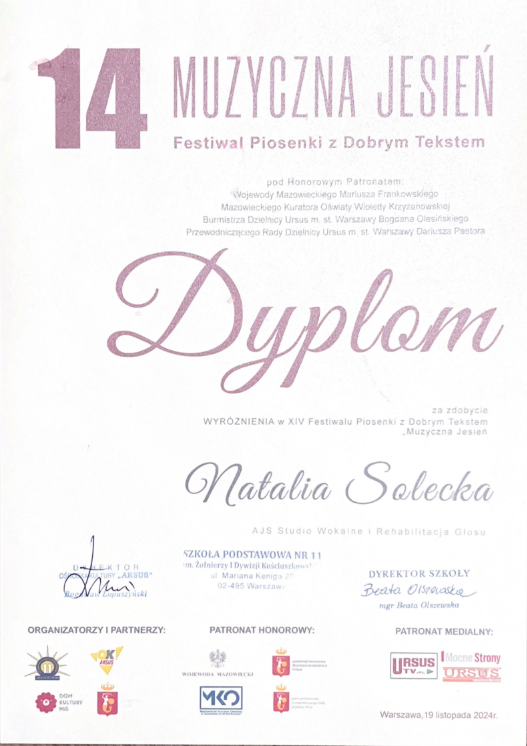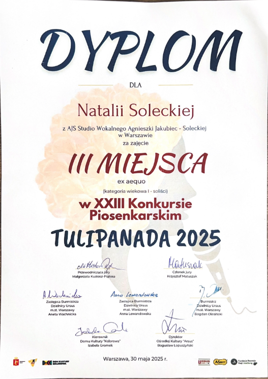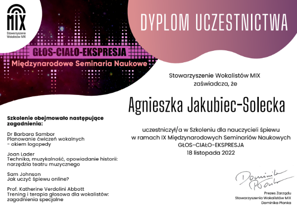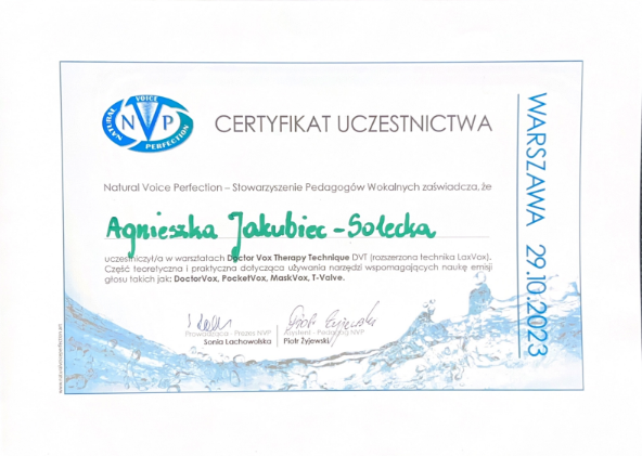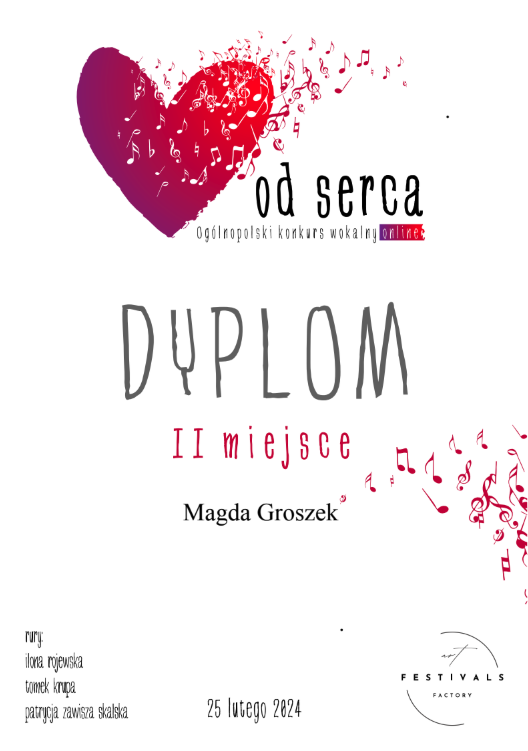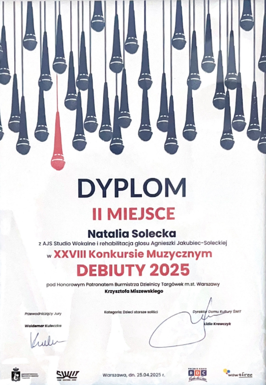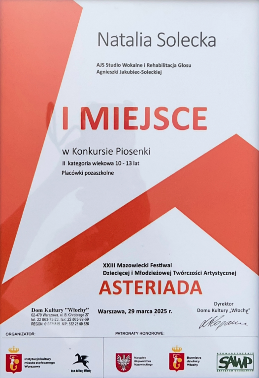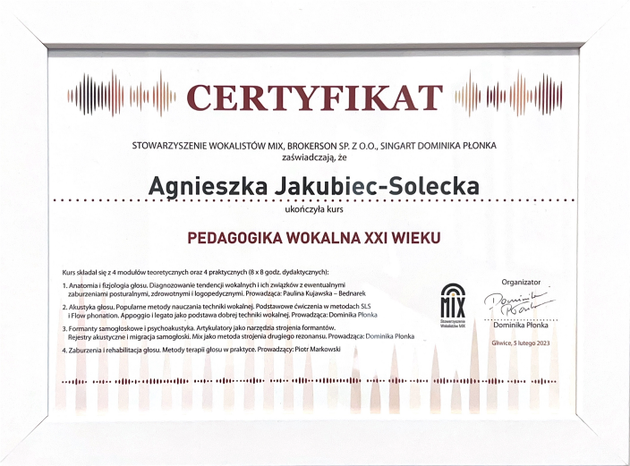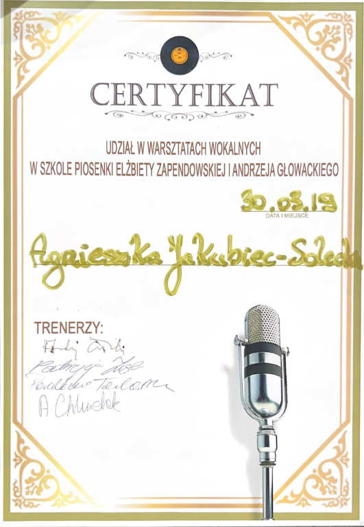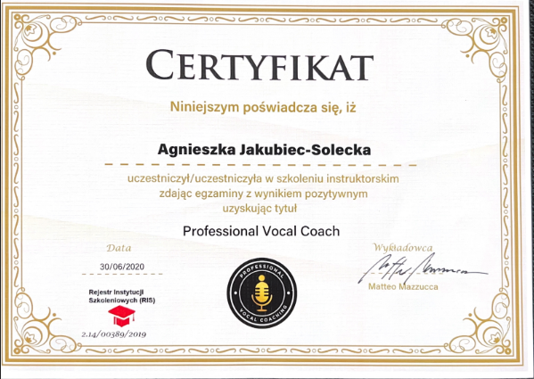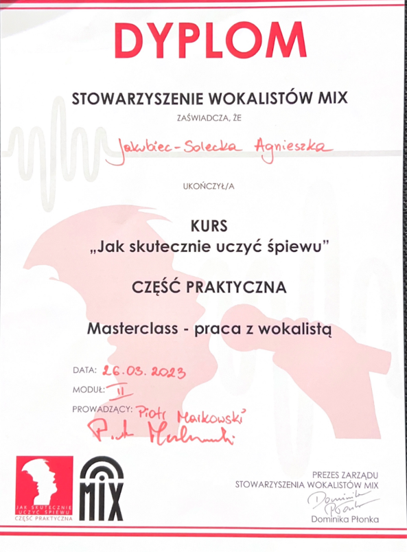 Pani Agnieszka jest ciepłą osobą mającą wspaniałe podejście do dziecka. Umie dobrze nakierować, dzięki czemu podopieczni odnoszą znaczne postępy i sukcesy w konkursach na szczeblu międzynarodowym i ogólnopolskim. Moja córka Magda rozpoczęła nauke kilka lat temu i trwa ona do dziś. Magda odnosi sukcesy na festiwalach oraz na deskach teatru muzycznego i to jest dowod na to, ze Pani Agnieszka jest świetnym nauczycielem stale podnoszącym swoje kwalifikacje. Gorąco polecam!